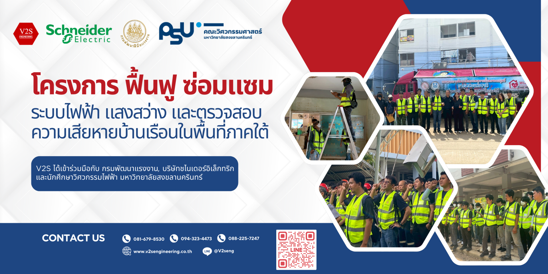โครงการฟื้นฟูซ่อมแซมระบบไฟฟ้า แสงสว่าง และตรวจสอบความเสียหายบ้านเรือนในพื้นที่ภาคใต้: วี ทู เอส เอ็นจิเนียริ่ง ลงพื้นที่ช่วยเหลือชาวหาดใหญ่